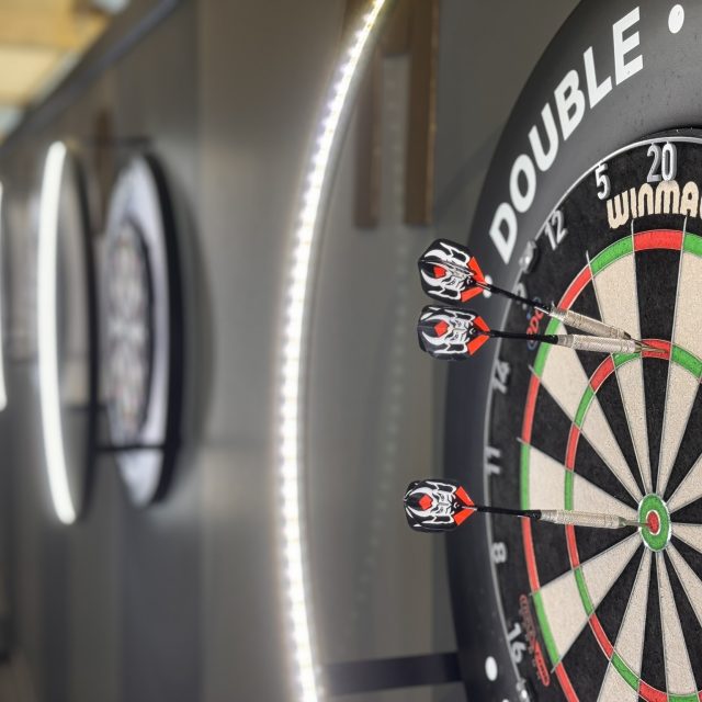 Spiele an unseren original WINMAU BLADE 6 Triple Core Turnierdart-Scheiben in unserer modernen Steeldart-Arena, einem extra Bereich für Eure eigene Meisterschaft. Als Zählhilfe für die Punkte erhaltet Ihr je nach Wunsch ein Tablet oder Oldschool Block und Stift,